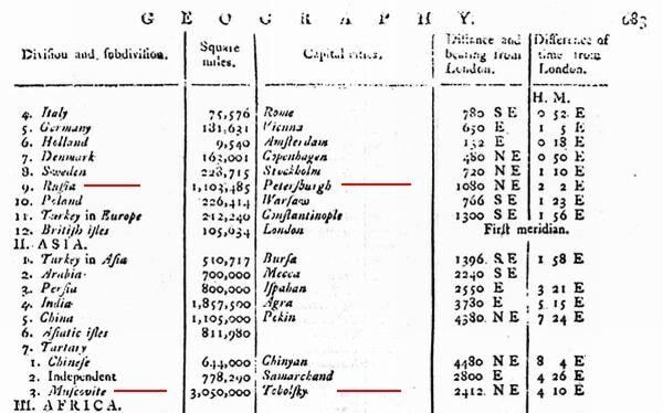 Раздел "География" в Британской Энциклопедии 1771 года заканчивается таблицей, где перечислены все известные страны, с указанием площади этих стран, столиц, расстояний от Лондона, и разницы во времени по сравнению с Лондоном (том 2, с.682-684), фрагмент. Судя по этой таблице, Российской Империи в том времени нет вообще. Зато авторами Британской Энциклопедии показаны несколько разных русских стран. Во-первых, Россия со столицей в Петербурге и площадью в 1.103.485 квадратных миль. Во-вторых - Московская Тартария со столицей в Тобольске и в три раза большей площади, 3.050.000 квадратных миль.