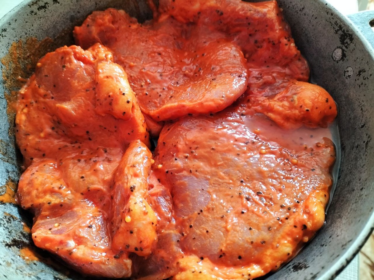 Для любителей мяса и остренького, этот домашний рецепт может очень даже пригодиться. Сделать румяный сочный стейк в духовке совсем несложно и хочу поделиться именно таким рецептом. Количество стейков на ваш аппетит) У меня было три штуки. Ингредиенты: Купленное сырое мясо желательно немного отбить молоточком. Я заворачиваю его в пакет, чтобы не было брызг и слегка обстукиваю с двух сторон. Выложить стейки в глубокую мисочку, посолите, поперчите по вкусу. В этом случае лучше посыпать чуть душистым перцем. Обмазать хорошенько аджикой и накрыв плёнкой, убрать в холодильник, пусть мясо промаринуется примерно пару часов. Через два-три часа, достать стейки. Форму для запекания смазать растительным маслом и выложить в неё стейки. Духовку включить на разогрев на 220 градусов. Форму накрыть фольгой, хорошенько подвернув по краям. Как только духовка разогреется до нужной температуры, поставить в ней форму с мясом. Время запекания 35-40 минут. Затем достать, снять фольгу и поставить обратно минут