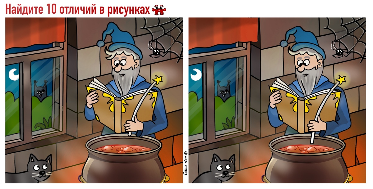 Найдите 10 отличий на рисунке про волшебника. Сложность выше среднего. Тест-задачка для памяти и внимания. Юмор, позитив для всей семьи.