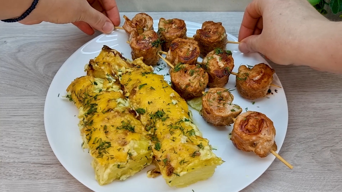 Картофель и свиные роллы готовы. При подаче посыпать накрошенным укропом. Приятного аппетита!