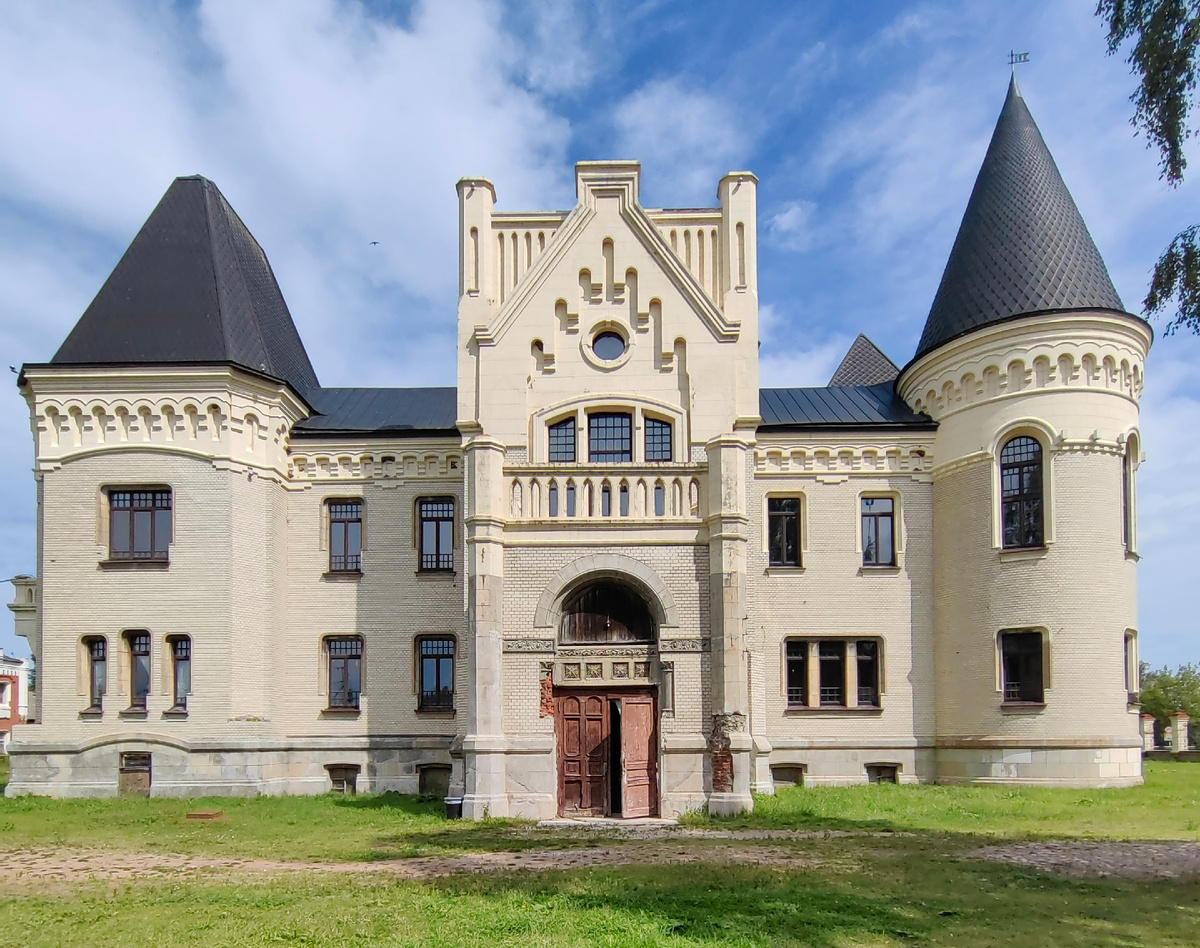 В последний отпуска мы решили проехать в одно весьма необычное место. В населенный пункт со странным названием Красный Профинтерн, где находится замок купца Понизовкина. Что касается названия населенного пункта, то сразу его расшифрую Профинтерн - это Красный ИНТЕРНационал ПРОФсоюзов (ПРОФИНТЕРН). Теперь кратко о замке. На самом деле не о замке (это народное название за красоту здания), а об особняке, выстроенном в 1910 году так, что он больше похож именно на замок. Построил его один из братьев Понизовкиных. Рядом с не менее красивым строением своего брата, которое было возведено на пару десятков лет раньше. В 19 веке Понизовкины создали здесь паточное производство. Дело шло в гору. В итоге ими был построен большой рабочий городок. На фотографии здание заводоуправления, где располагалась администрация и фабричная бухгалтерия. Здание протяженное. Напоминает внешне строения в Петергофе и Стрельне. После экскурсии по особняку я так сразу не рассскажу вам всю истории фамилии и точные д