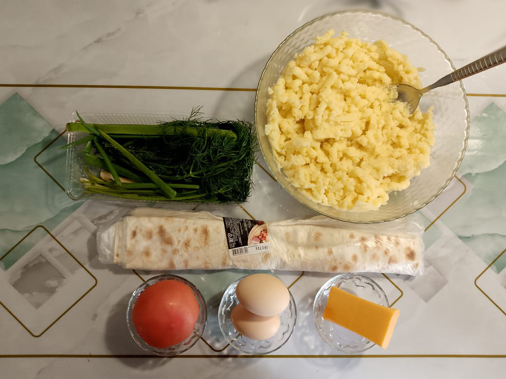 Готовим вкусное и быстрое блюдо. Нам понадобиться: 1 тонкий лаваш 400 гр. картофельного пюре 2 яйца Сыр «Чеддер» 50 гр. Лук зеленый Укроп 1 помидор Соль, перец по вкусу Оливковое или подсолнечное масло для обжарки. Готовим картофельное пюре по своему вкусу, у меня уже подсолено, с добавлением сливочного масла и молока для нежности. Можно использовать пюре если оно, например осталось от ужина или обеда. Сыр трём на крупной тёрке. Зелень шинкуем. Помидор режем на небольшие кубики. Добавляем в картошку все порезанные ингредиенты, а также разбиваем 2 яйца. При необходимости солим и перчим. Всё хорошенько перемешиваем. Берем наш лавашик и разделяем его на равные части. На одну сторону выкладываем начинку так, чтобы у нас осталось место её завернуть. Закручиваем раз. Закручиваем два. Немного придавливаем чтобы он у нас получился немного плоским. На сковороду добавляем оливковое масло и нагреваем. Как масло нагрелось выкладываем наши палочки и жарим на среднем огне по 2 минуты с ка