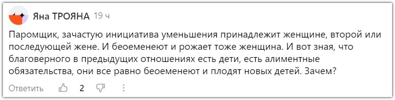 В обсуждениях под статьёй о несправедливостях делёжки алиментов разгорелись нешуточные страсти. Возмущённые делили детей на сорта, упрекали суд в том, что он слеп и не видит равенства всех перед законом, но самое главное не в этом. А в том, кого назначили виноватой во всех этих пертурбациях. Снова виновата женщина! Как ни крути - снова женщина виновата, а мужчина так, рядом постоял. Но это всё лирика. А вопрос поставлен достаточно интересный: куда женщина смотрит, когда связывается с человеком, имеющим детей и алиментные обязательства? Не должна ли она при первых признаках отца-героя насторожиться и отказать тому в доступе к телу, дабы не "плодить новых детей"? Мы же помним, что мужчины здесь тоже достаточно беспощадны, и всю ответственность за рождение детей снова возлагают на женщину? Если не помните, то напомню: Итак, куда женщина смотрела? А смотрела она на мужчину. Мужчина вроде приличный, не пьёт-не курит (опционально), серьёзный и слегка потрёпаный жизнью. Хороший в целом муж