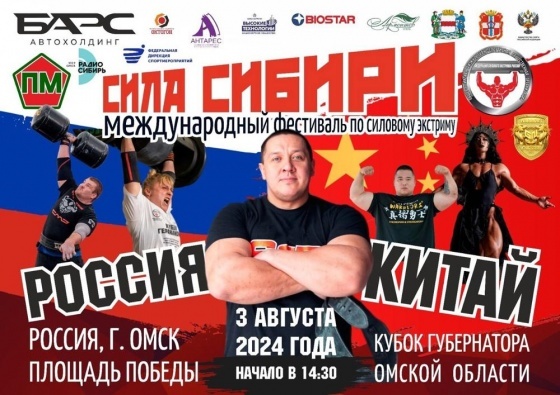 В День города пройдет международный фестиваль по силовому экстриму «Сила Сибири» Участники поборются за главный приз – Кубок Губернатора Омской области. В Омске в День города пройдет международный фестиваль по силовому экстриму «Сила Сибири» Команду России представят Евгений Марков, Дмитрий Хвостенко, Александр Никифоров, Екатерина Зайцева, Юлия Клочкова и Ксения Батурина. Конкуренцию им составят спортсмены из Китая. Мужчинам предстоит выполнить подъем богатырского бревна весом 360 кг, становую тягу автомобиля весом 320 кг и перенос богатырской карусели весом 350 кг, а также привести в движение в технике «арм-овер-арм» автопоезд весом 12 тонн. Женщины выполнят кантовку покрышек весом 100 кг, 200 кг, 300 кг, становую тягу автомобиля весом 220 кг и перенос богатырской карусели весом 200 кг, продемонстрируют «арм овер арм» автопоезда весом 8 тонн. Также в программе фестиваля состоится попытка установления рекорда России в буксировке автомобилей самой сильной женщиной России Екатериной Зай