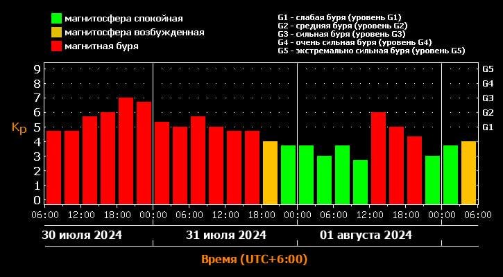 На сайте Лаборатории солнечной астрономии ИКИ и СИЗФ появился прогноз магнитных бурь на ближайшие дни. Так, геомагнитные возмущения ждут жителей Омской области несколько дней подряд. По прогнозу специалистов, буря началась в ночь на вторник, 30 июля, и продлится до вечера среды, 31 июля. Её пик ожидается во вторник с 12:00. В этот период магнитная буря достигнет уровня G3 (сильная). Затем она ненадолго утихнет, а в полдень 1 августа вновь накроет Омскую область, достигнув уровня G2 (средняя). В этот период метеозависимые могут почувствовать ухудшение состояния: головную боль, скачки артериального давления, головокружение, затруднённое дыхание, нарушение сна, тревожность, усталость и раздражительность. Шкала мощности магнитных бурь: G1 — незначительная (буря может вызвать слабые колебания в энергосистеме, оказать незначительное влияние на работу спутников); G2 — умеренная (буря может спровоцировать проблемы с напряжением в энергосистемах, повреждение трансформаторов); G3 — сильная (могу