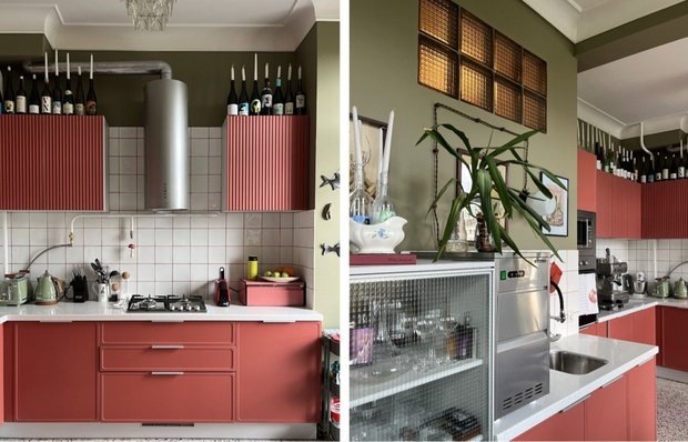 Продуманный функционал, яркий дизайн, много хранения Эта кухня находится в пятикомнатной сталинке 1939 года постройки. В ней проживает психолог и преподаватель Люба Мурашова вместе с мужем, двумя детьми и няней. Люба самостоятельно продумала перепланировку и дизайн квартиры. Особого внимания заслуживает кухня, совмещенная с гостиной. Она получилась яркой, эргономичной и очень функциональной. Для отдели стен выбрали матовую краску оливкового цвета, а мебель заказали в ярком коралловом оттенке. Такое сочетание выглядит смело, энергично и самобытно. Яркий дизайн уравновесили белой плиткой на фартуке, дополнив ее контрастной затиркой в коралловом оттенке. На полу — плитка терраццо. Она не маркая, подходит под любой стиль интерьера, имеет долгий срок службы и устойчива к повреждениям. Семья большая, готовят много, поэтому в кухне предусмотрели много бытовой техники. Здесь есть колонна со встроенными СВЧ и духовым шкафом, винтажная кофемашина, капсульная кофемашина, газовая варочная панель н