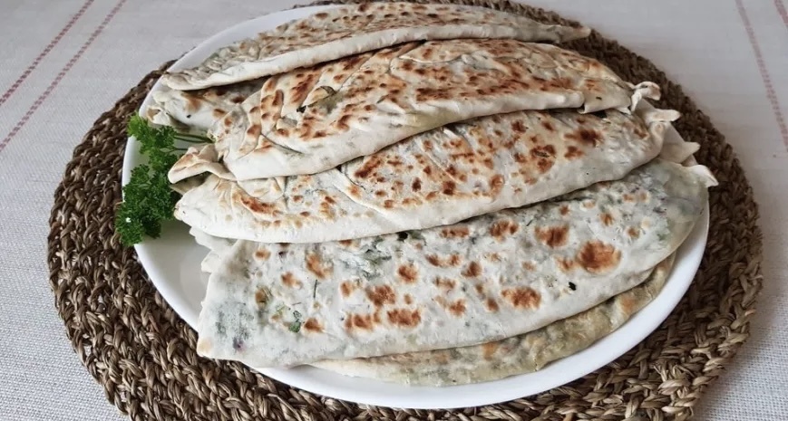 Формование лепешек: После расстойки тесто вымесить еще раз, разделить на небольшие колобки (по 50 г), выложить на припудренную мукой поверхность, сверху вновь присыпать мукой и накрыть пищевой пленкой. Поочередно раскатывать каждую заготовку как можно тоньше, придавая ей форму круга. На середину раскатанного пласта теста, отступив от краев по 2 см, выложить присоленную и промасленную зеленую начинку по принципу: начинки много не бывает! Аккуратно залепить края посередине, придав заготовке форму лепешки. Ребром ладони прижать шов.