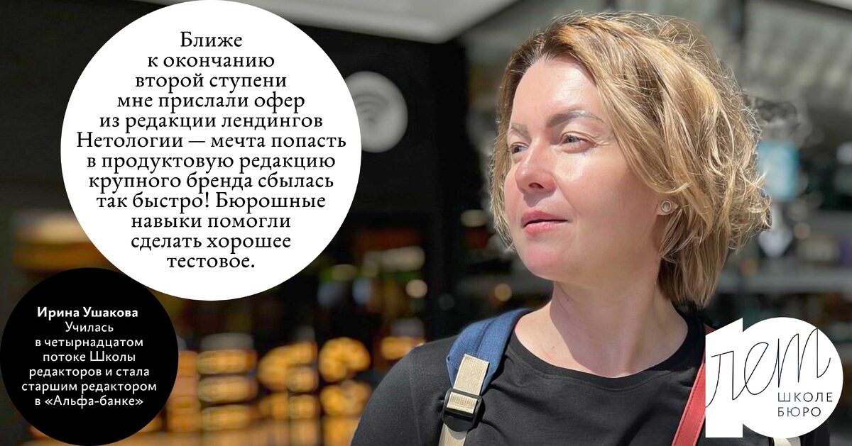 Ирина Ушакова училась в четырнадцатом потоке Школы редакторов и стала старшим редактором в «Альфа‑банке» — история студентки к 10‑летию Школ
