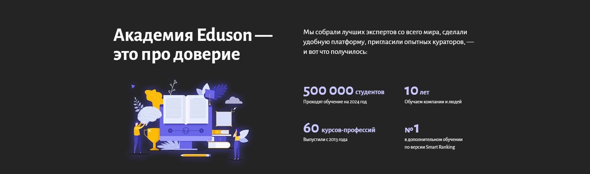 Академия Eduson — это ведущий сервис онлайн-обучения, который с 2013 года помогает людям осваивать востребованные на рынке труда навыки. С более чем 450 000 учеников и успешным опытом обучения сотрудников компаний-лидеров, таких как РЖД, МТС, Сбербанк, Евросеть и другие, Eduson Academy занимает одно из лидирующих мест в EdTech-направлении.