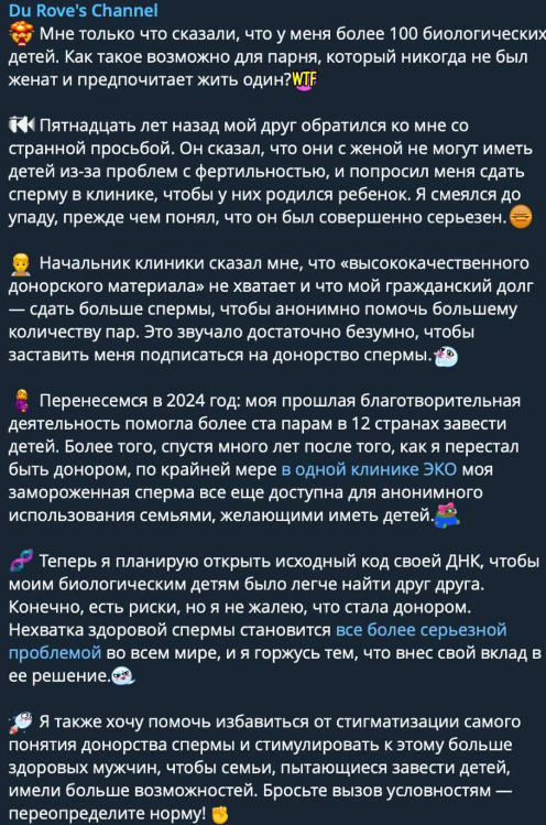 Павел Дуров рассказал, что у него более 100 биологических детей.