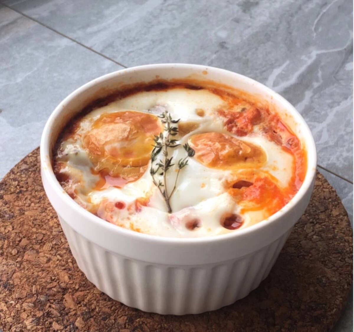 Вчера муж сказал: - Приготовь мне завтрак-обед! Да, и такое бывает 💁🏻♀️ Что за блюдо такое может справится с вселенским утренним голодом? Да все просто: яйца по-испански 🍳 В оригинальном рецепте нет фарша, но нам же нужен «завтрак-ОБЕД», так что я добавила фарш из куриной грудки. Получилось пальчики оближешь 🤌🏻 (1 порция) Включи духовку на 180 градусов. Нарежь лук, перец мелким кубиком. Приступим к приготовлению начинки: В разогретую сковородку налей масло, положи фарш, добавь соль, чёрный перец, тимьян, очищенный от веток. Жарь до готовности. Добавь лук, жарь до мягкости. Добавь сладкий перец, перемешивая, обжарь до готовности. Добавь томаты в собственном соку, перемешай все вместе, через минуту убери с плиты. Выложи овощи с фаршем в форму для запекания. У меня это кокотница, если такой нет, то подойдёт большая керамическая кружка. Добавь в форму яйца. Отправляй в духовку, пока, яичный белок не побелеет. Все готово, приятного аппетита 😋