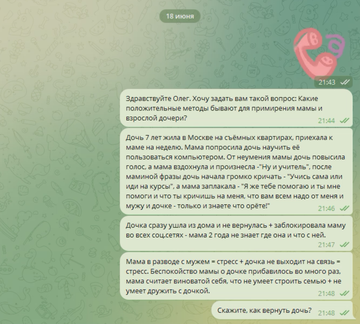 Если искренне проговаривать данные аффирмации ежедневно, то ситуация в корне может измениться, даже если у матери сейчас нет связи с дочерью через телефон или другие мессенджеры. Между матерью и дочерью существует иная связь - на уровне души.