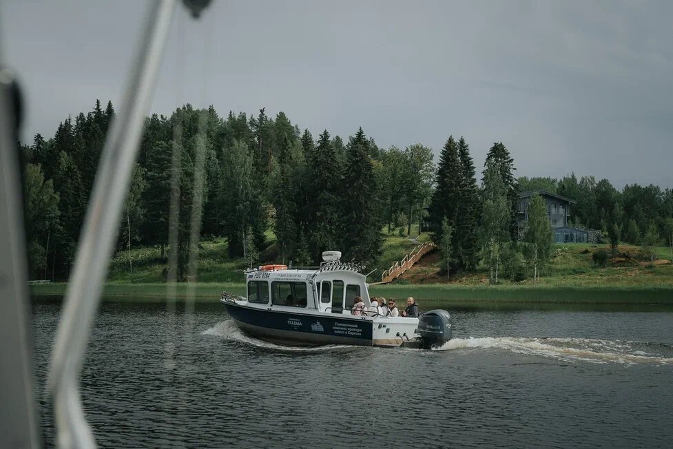 На крытых больших катерах по воде отправимся в ресторан на природе по Ладоге.