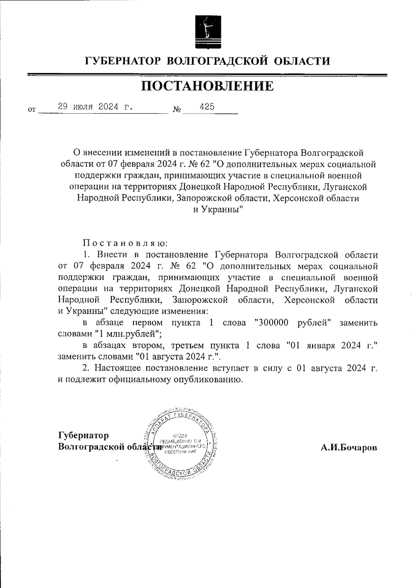 Размер единовременной выплаты для участников специальной военной операции увеличен в Волгоградской области более чем в три раза — с 300 тысяч до 1 миллиона рублей. Соответствующее постановление опубликовано на сайте администрации региона. Изменения внесены в постановление губернатора Волгоградской области № 62 "О дополнительных мерах социальной поддержки граждан, принимающих участие в специальной военной операции на территориях Донецкой Народной Республики, Луганской Народной Республики, Запорожской области, Херсонской области и Украины". Единовременную выплату размеров 1 миллион рублей получат все, заключившие контракт о прохождении военной службы не ранее 1 августа 2024 года. Это уже второе с начала года повышение единовременной выплаты участникам СВО из Волгоградской области. С 1 января региональную компенсационную выплату увеличили на 200 тысяч рублей — с 100 до 300 тысяч рублей. Сейчас в администрации региона пояснили, что указанная сумма (1 млн) будет складываться из средств фе
