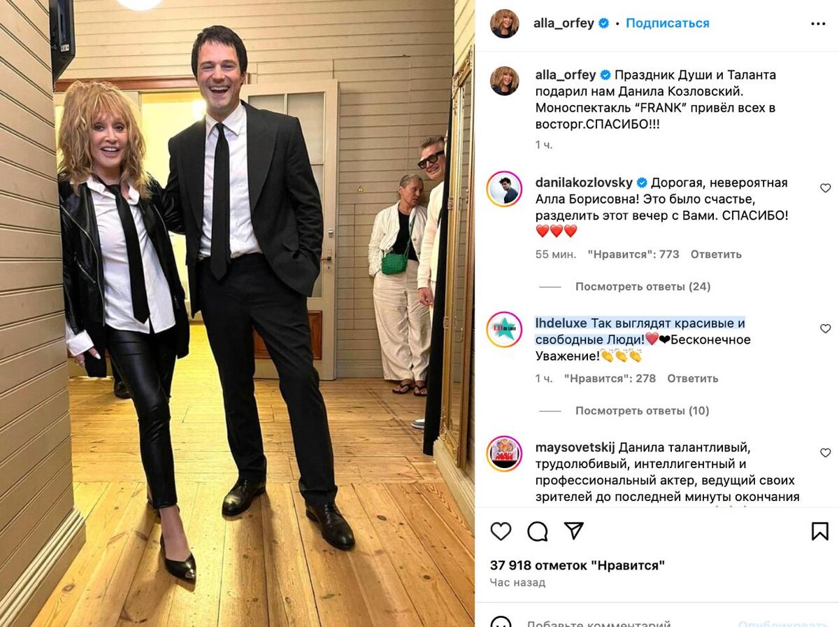 В комментариях Пугачёвой и Козловскому написали: «Так выглядят красивые и свободные люди!», со своей стороны хотелось бы добавить: «Не признанные Минюстом иноагентами!» Кстати, выглядят они так на фестивале «Лайма Рандеву», поселковом мероприятии, далёком от музыки, сугубо политическом и антироссийском. Дела, конечно. «Чулпан Хаматова не пообщалась с Аллой Пугачевой в Юрмале. На днях Примадонна решила посетить моноспектакль Данилы Козловского. Она вышла в свет в кожаных лосинах и рубашке с галстуком. После спектакля Алла Борисовна пошла за кулисы. Также на спектакле были Максим Виторган и Чулпан Хаматова. С последней певица не смогла поговорить. Чулпан была не в настроении и сразу покинула спектакль. А вот с Данилой певица даже сделала фото. Она давно с ним дружит. В свое время Примадонна даже снялась в клипе на трек к фильму «Чернобыль», в котором снялся Козловский».