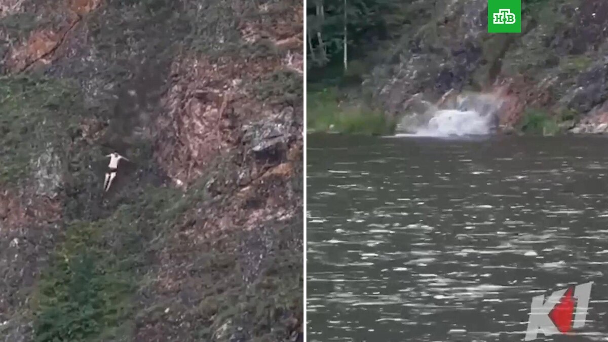 [ Смотреть видео на сайте НТВ ] В Красноярском крае мужчина залез на высокую скалу и сорвался с нее. Очевидцы сняли падение мужчины на видео. На кадрах видно, как мужчина лезет на скалу вместе с товарищем. В следующий момент он срывается вниз и падает в водоем. В соцсетях пишут, что ЧП произошло в поселке Усть-Мана. Сорвавшийся со скалы мужчина чудом избежал тяжелых травм. Его товарищ тоже не пострадал. [ Смотреть видео на сайте НТВ ]