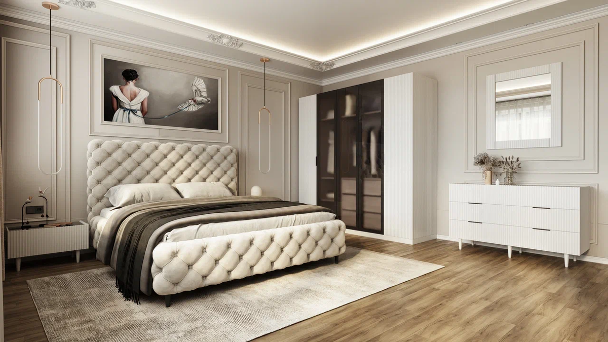Шкаф оснащен подсветкой, управляемой датчиком, встроенным комодом, ящиками с доводчиками скрытого монтажа. Высокие опоры визуально облегчают конструкцию и упрощают процесс уборки. С помощью визуализации вы можете заглянуть в спальню своей мечты!