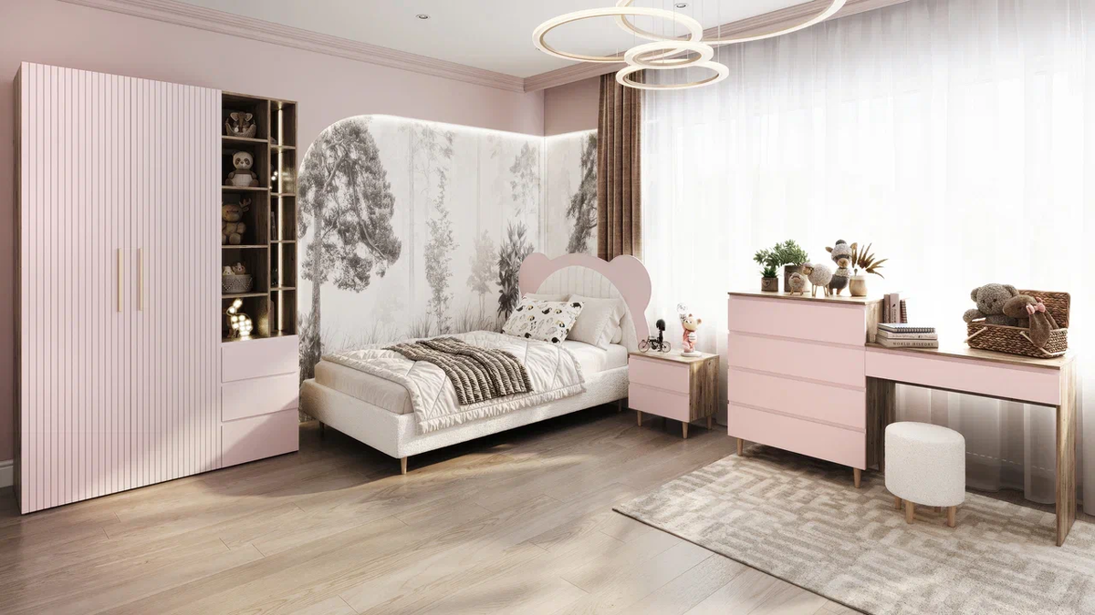 Стильная, мягкая кровать подарит отличный и здоровый сон, а мягкий пуф станет отличным и стильным завершением комнаты. Вместительный шкаф позволит разместить все вещи, а декоративная подсветка придаст изюминку комнате.