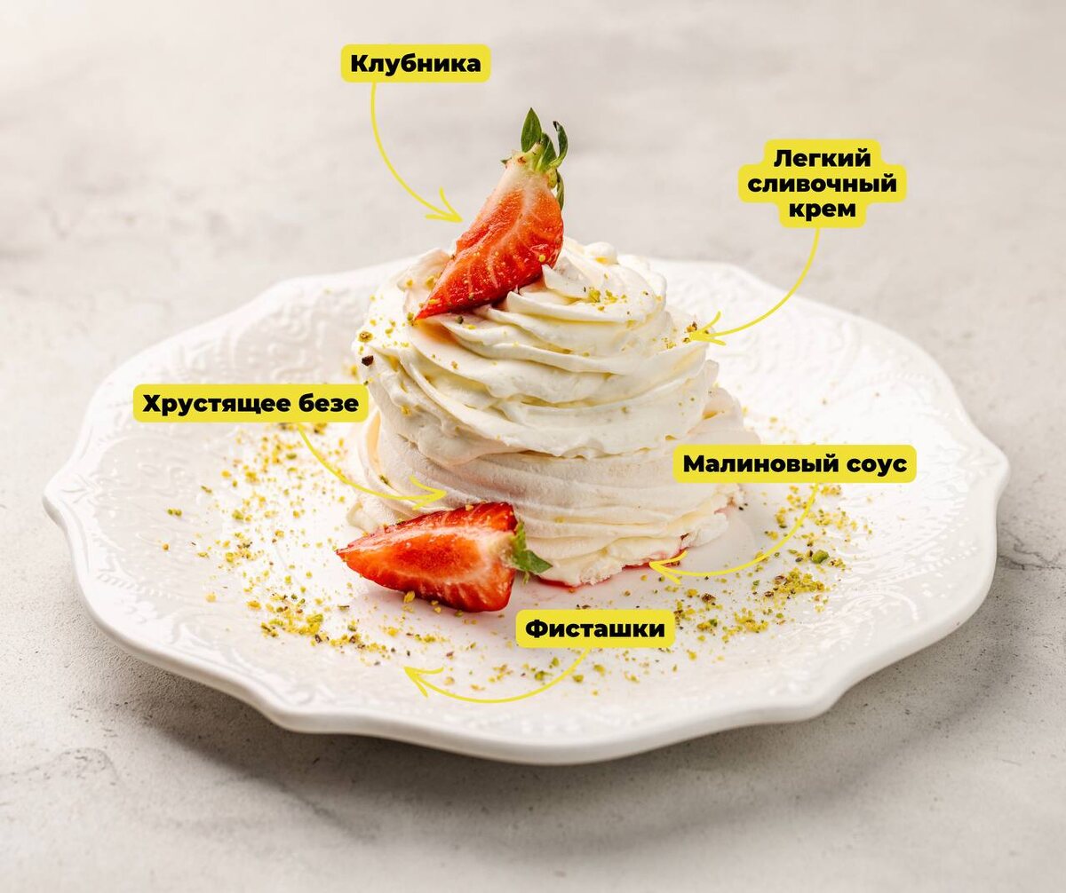Он сочетает в себе нежный сливочный крем, хрустящее безе, которое тает во рту, свежую клубнику, малиновый соус и фисташки.