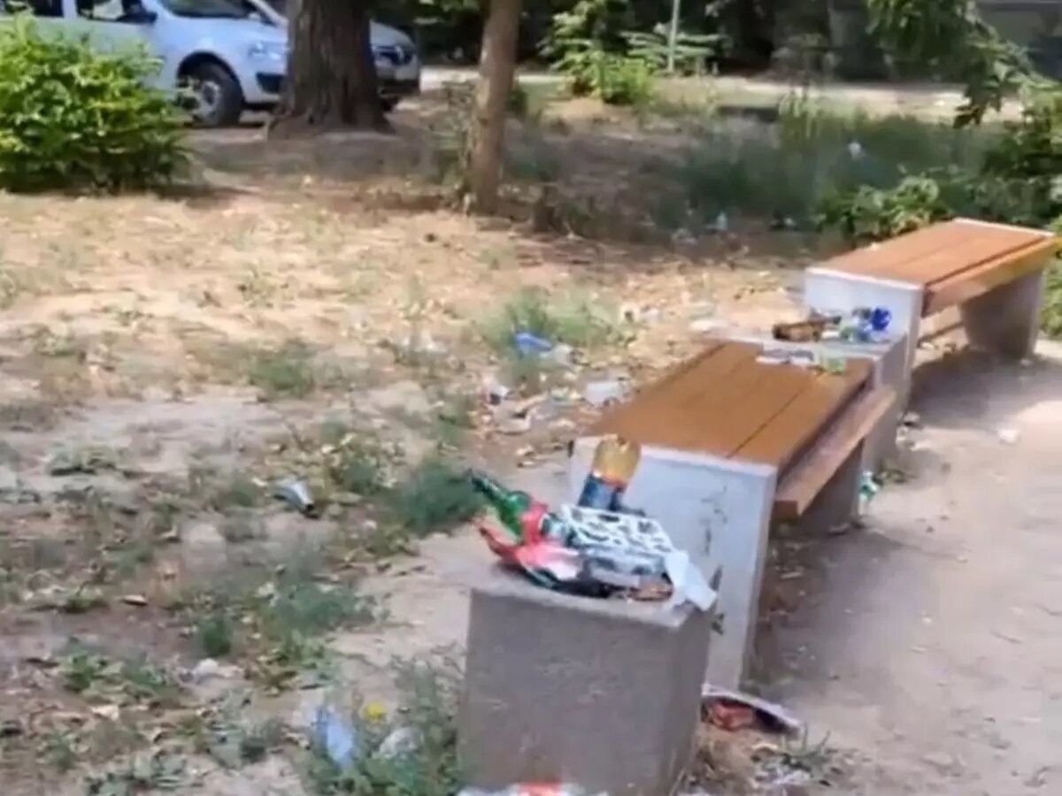 Один из родителей снял на видео весь ужас, происходящий на детской площадке. На кадрах видно, что по всей территории разбросаны сотни пустых бутылок. Отходы вываливаются из мусорных баков.