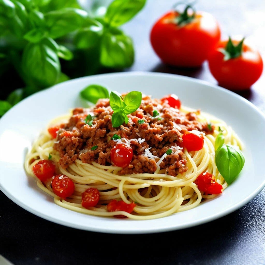 **Спагетти с мясным соусом** **Ингредиенты:** - 300 г спагетти - 400 г мясного фарша (свинина, говядина или смешанный) - 1 луковица (около 100 г) - 2 зубчика чеснока - 400 г консервированных томатов в собственном соку или томатного пюре - 2 столовые ложки оливкового масла (30 мл) - 1 чайная ложка сушёного орегано - 1 чайная ложка сушёного базилика - Соль и перец по вкусу - 50 г тёртого пармезана (по желанию) - Свежая зелень для украшения (базилик или петрушка) **Приготовление:** 1. **Подготовка ингредиентов:** - Очистите и мелко нарежьте луковицу (примерно 1-2 минуты). - Очистите и измельчите 2 зубчика чеснока (примерно 1 минута). 2. **Обжарка фарша:** - В большой сковороде разогрейте 2 столовые ложки оливкового масла на среднем огне (около 1 минуты). - Добавьте нарезанный лук и обжаривайте до мягкости и прозрачности, примерно 3-4 минуты. - Добавьте измельчённый чеснок и обжаривайте ещё 1 минуту. - Добавьте мясной фарш, посолите и поперчите по вкусу, обжари