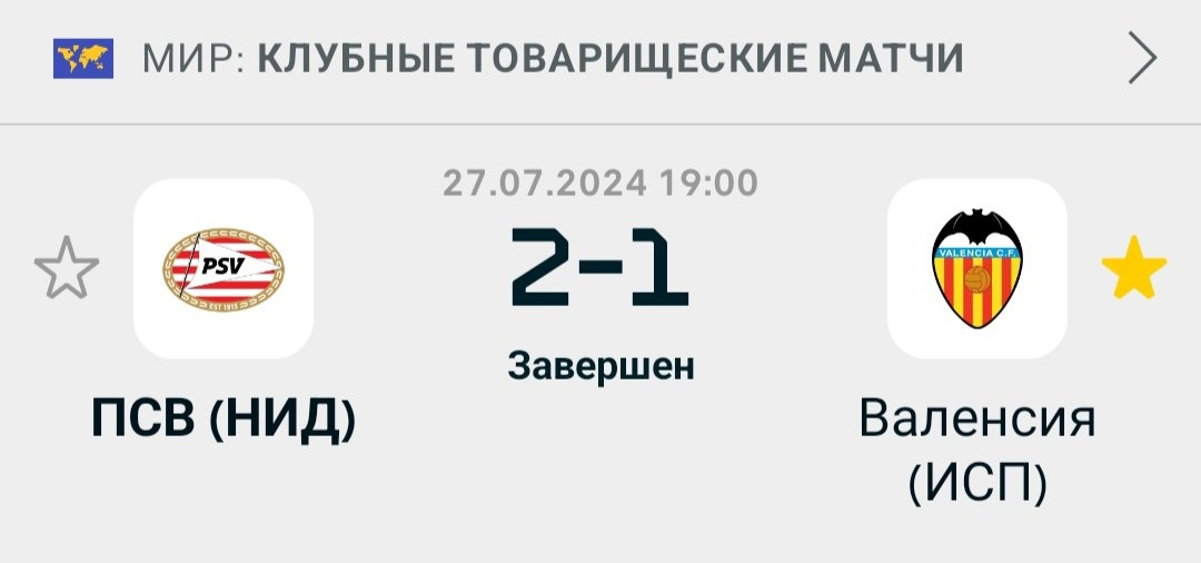 Друзья всем добрый вечер. Я всё-таки нашла в себе силы разобрать матч ПСВ Валенсия в день игры. Команды играли друг против друга последний раз 28 июля 2018 года. Это также была летняя предсезонная подготовка. Было Это перед началом сезона 2018-2019. В том сезоне Валенсия выиграла кубок Испании. Но это уже совсем другая история. В том товарищеском поединке во время подготовки к новому сезону Валенсия проиграла со счётом 2:1. Сегодня кажется наступил день реванша. У Валенсии появилась возможность обыграть своего соперника и отомстить за то поражение шестилетней давности. Хотя многие перед этой игрой предполагали, что летучим мышам будет очень сложно. ПСВ по итогам прошлого сезона стал чемпионом Нидерландов. Валенсия в свою очередь в чемпионате Испании активно боролась за попадание в еврокубки. К сожалению команда Рубена Барахи под конец сезона видимо подустала и из-за этого заняла лишь девятое место в Чемпионате и конечно в Еврокубки попасть не смогла. Такое бывает. Валенсия плохо начала