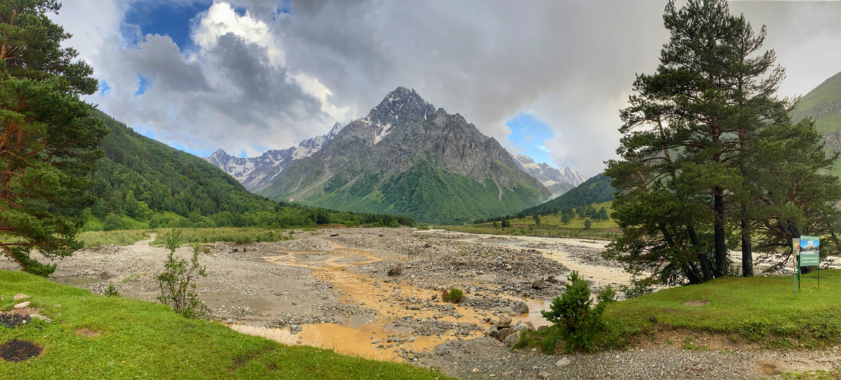 Когда дождь закончился, начали пеший путь. Продолжаем идти вдоль реки «гара-аузусу» и горы «Тихтенген» ( её высота 4611 м) С того момента, как мы встали на тропу, перед нами открылись захватывающие дух панорамные виды на окружающие Кавказские горы, включая такие вершины, как Шхара. Много хвойных деревьев, облака опускаются очень низко. По другую сторону от нас пасутся лошади почти чёрного цвета. Проходим интересные строения с живописным видом. По пути встречаются прозрачные ручьи и водопады, которые каскадами сбегают по с