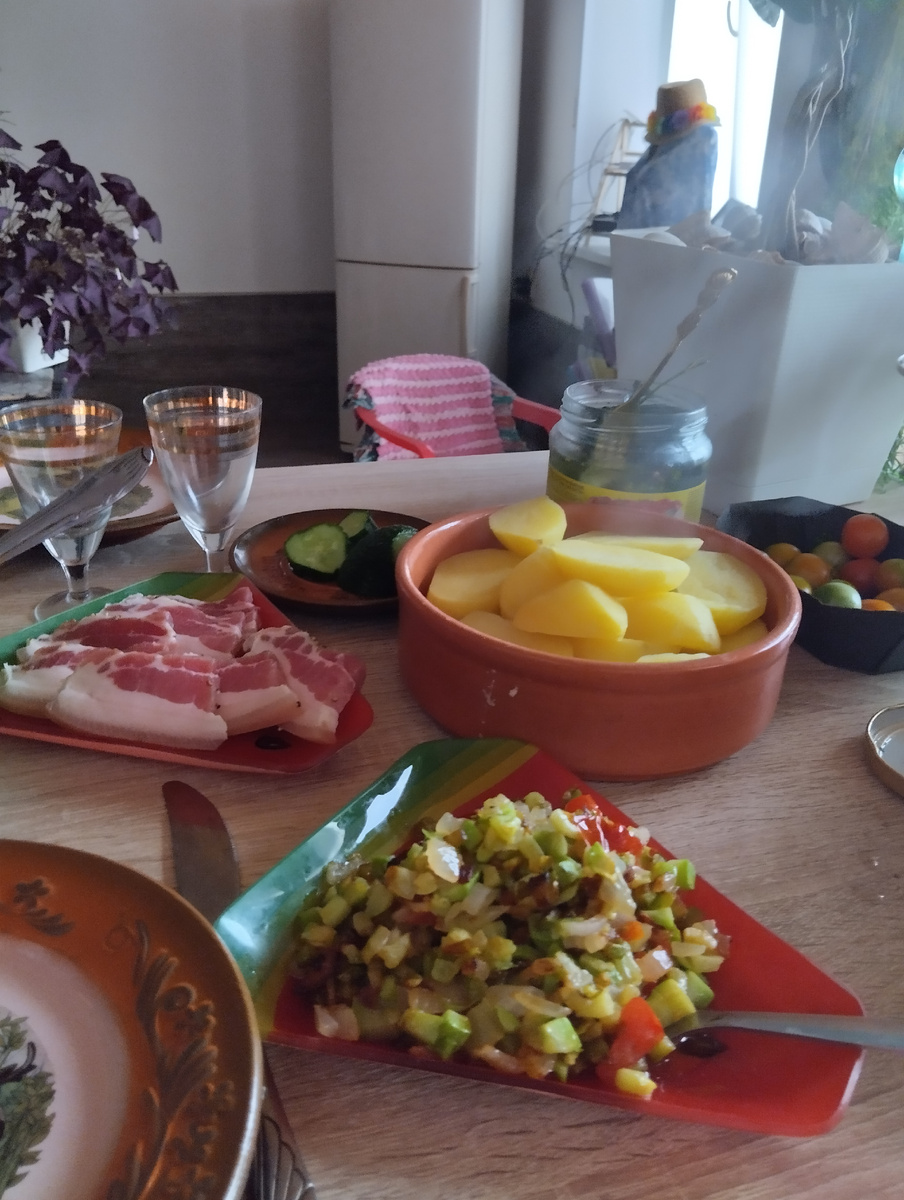 Привет, друзья! Картошку мы редко едим, не каждый день, но тут захотелось. А все потому что в КБ я купила кусок сала, по виду очень напоминающим итальянский прошутто, которым мы с @denseman лакомились в Турине, оказалось и по вкусу тоже. Цена же на кусок была демпинговой, чуть больше, чем 100 рублей, что удивительно. По дороге домой в фермерском ларьке купили картошки. Пока картошку поставила варить, сходила на свой смешной огород, собрала немного огурцов, сорвала кабачок. Кабачок пожарила, огурцы покрошила в салат, достала малосольные огурцы из холодильника, сало порезала. Вот такой у нас был ужин во вторник. Пыталась сфотографировать так, что бы было видно, что картошка с пылу, с жару - пар вошёл в кадр. Когда покупала картошку, продавец пыталась мне пристроить различный экзотический товар, но я сказала, что на ужин у меня будет картошка, сало и малосольные огурцы со своего огорода., на что та спросила "а стопарь? " 😁 Вместо "стопаря" у нас с @denseman было по бокал