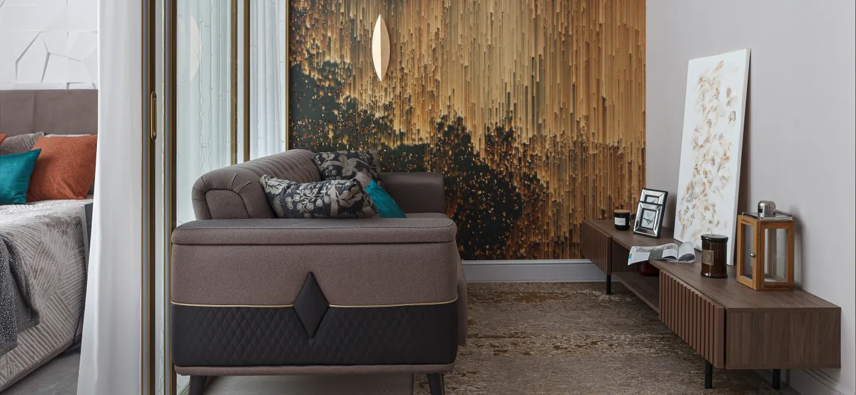 Стену в гостиной оформили с помощью яркой фрески с абстрактным рисунком в золотистых тонах. Рисунок выбирали очень долго под настроение заказчика — смотрели готовые фрески в каталогах, обои, но ничего не подходило. В итоге нашли картину в «Шаттерстоке», выбрали нужный фрагмент и заказали его печать.