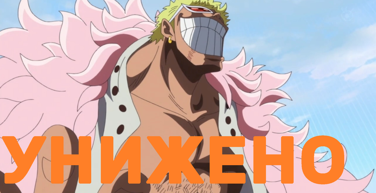 Третий момент — сам Донкихот Дофламинго, который считается одним из лучших злодеев в ВанПис. Раз уж считается, то надо бы прокомментировать, наверно. Ну-с, пожалуй, да, на фоне какого-нибудь Вапола или Дона Крига он явно сияет. Если же в целом, то... Тоже, полагаю, но уже сложнее. Крокодайл не хуже, Тич не хуже, Катакури не хуже(хотя это немного другое). Поэтому да, перец довольно занятный и злодейски харизматичный, но я бы не сказал, что это однозначный топ-1.