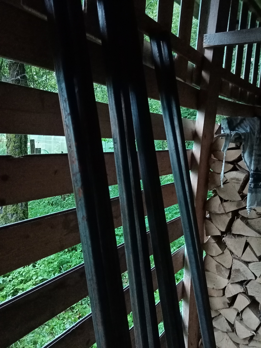 Вот так должно получится. Это пока внакидку, вдела и прислонила к дровнику. Это дуги потоньше, потому что те, что хочу вставить в теплицу, еще на грядке, подпирают помидоры.