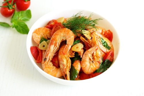 На кол-во порций:2 Подготовить все ингредиенты для жаренных креветок на сковороде. Креветки лучше брать королевские, в панцире. Они получаются сочными за счёт того, что весь сок задерживается в панцире, и мясо остаётся нежным. Конечно, можно использовать креветки и небольшого размера, а может, и вовсе очищенные. Времени на приготовление таких креветок понадобиться меньше. Самое главное правило нежного мяса в том, что креветки нельзя долго готовить. По сути, розовые креветки уже предварительно приготовлены, и их остаётся только довести до идеального вкуса. Если вы берёте не розовые, а серые креветки, то нужно увеличить немного время приготовления блюда. Предварительно размораживать креветки не обязательно. Они быстро отходят при жарке Очистить чеснок от шелухи и нарезать на тонкие лепестки Промыть помидоры, удалить плодоножку. Нарезать черри на половинки. Выбирайте самые спелые, сладкие черри. Не стоит заменять их обычными помидорами. Черри очень мясистые и сладкие, именно такие поми