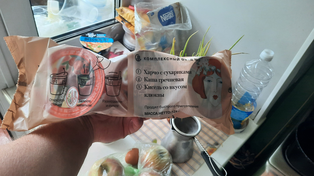 Я залил кипятком сразу все три стакана и дал постоять буквально пять минут, затем открыл крышки и приступил к дегустации супа харчо. Гречневая каша и кисель пока остывали, так как были залиты крутым кипятком.