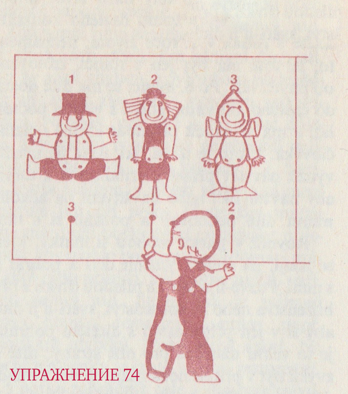 Примером может быть упражнение 45 этого раздела. Ребёнок видит перед собой 3 кнопки, а рядом 3 лампочки, которые соединены между собой таким образом, что после нажатия 1-ой кнопки загорится 2-я лампочка, после нажатия 2-ой – 3-я лампочка, а после 3-ей—1-я лампочка. Свидетельством понимания взаимосвязи между кнопкой и лампочкой является то, что перед нажатием кнопки ребёнок смотрит на лампочку, которая должна загореться. Подобную игрушку можно изготовить из коробки, сделав 3 входящих и 3 выходящих отверстия, соединённые т. о., что после опускания шарика в 1-е отверстие он выйдет из 2-го выхода и т. д. Другой подобной игрушкой могут быть 3 куклы-марионетки на верёвочках, прикреплённые к доске. Верёвочки, приводящие их в движение, спрятаны за доской, а в отверстия наружу выведены только окончания верёвочек. Потянув за верёвочку под первой куклой, мы приводим в движение 3-ю куклу и т. д. Ребёнок в конце 9-го месяца поймёт эту взаимосвязь и, опустив шарик в определённое входящее отверстие, сразу смотрит на то выходящее отверстие, из которого ожидается появление шарика.