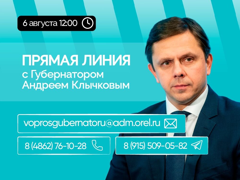 6 августа в 12:00 состоится традиционная прямая линия с Губернатором Орловской области Андреем Клычковым, в ходе которой он ответит на вопросы жителей региона.