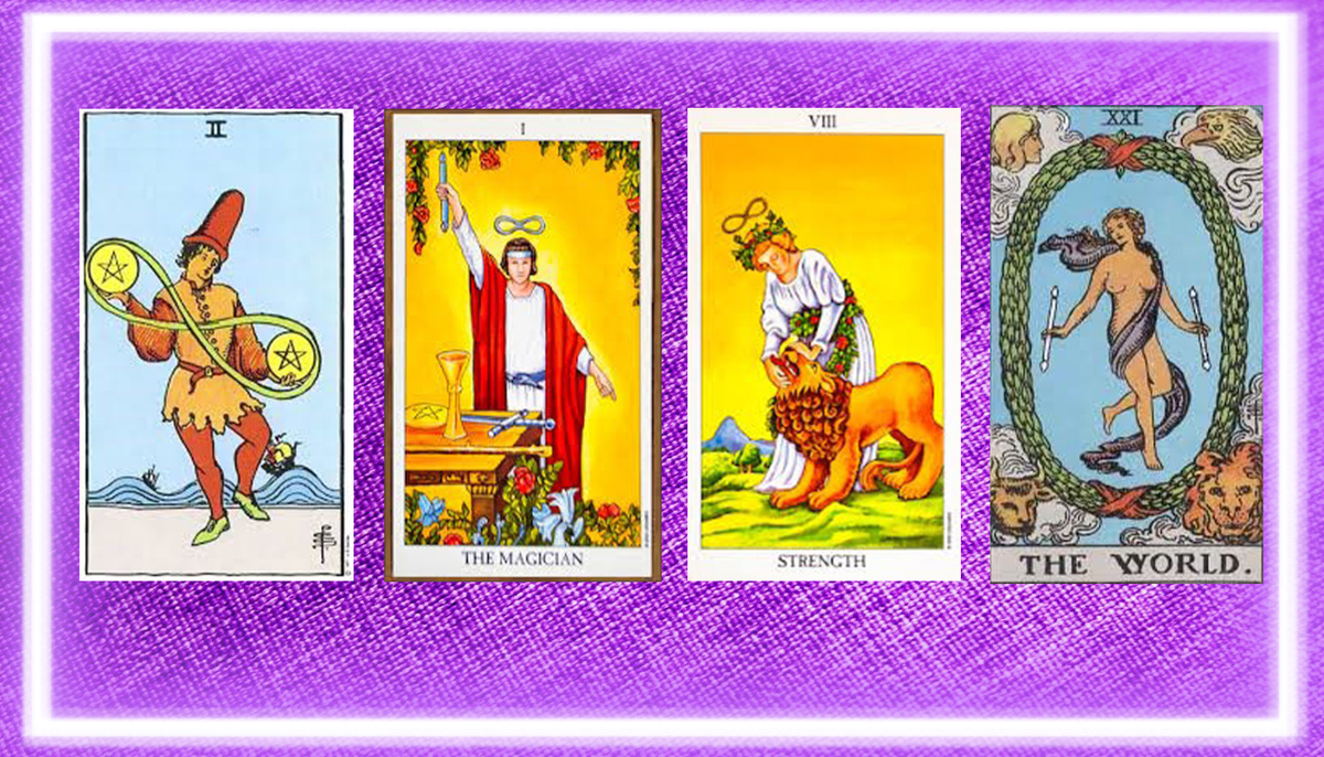 Слово «лемниската» в переводе с латыни означает «украшенный лентами». Визуально это выглядит как символ бесконечности. Это символ из математики, который использовался с давних времён в арабской, индийской и тибетской культурах. Символ бесконечности может быть нарисован одним непрерывным движением, не имеющего ни начала, ни конца. По сути, это – два равных круга рядом с точкой соединения в центре. Существует змей Уроборос, кусающий себя за хвост, он также является символом цикличности и бесконечности: любое окончание является началом. Лемниската делает отсылку к этому змею и его основной идее. Есть четыре карты Таро, на которых изображена лемниската. Это Двойка Пентаклей и Старшие Арканы Маг, Сила, Мир. Двойка Пентаклей Все двойки связаны с принятием решения. Пентакли не любят ни от чего отказываться. Двойка Пентаклей не пытается уклониться от решения, а хочет оставить оба. Здесь мужчина балансирует между двумя противоположными пентаклями (которые обвиты лемнискатой), предполагая, что