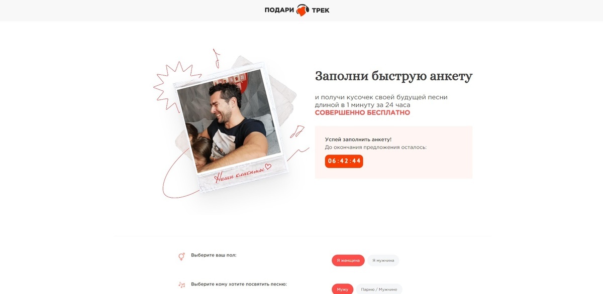 Делимся инструкцией, как БЫСТРО заказать его! Всего 3 шага: Ребята занимаются созданием песен по вашим историям любви и жизни почти 10 лет. Вам ничего не надо петь и сочинять, они всё сделают сами. С вас только история и пожелания – с них готовая песня. После ее заполнения вам пришлют отрывок вашей будущей песни для ознакомления абсолютно БЕСПЛАТНО! Представляете? Возможность ознакомиться с подарком до какой-либо оплаты! Если нравится – оплачиваете заказ и его допишут до конца, а если не понравится – вы ничего не должны! Готовый заказ вы получаете в формате mp3 на свою электронную почту или в вотсап, скачиваете на любое устройство и вручаете близкому человеку где угодно! А главное, что песня – это универсальный подарок, который подойдёт каждому. Только посмотри на эти эмоции👇🏼 Закажи свою личную песню БЕСПЛАТНО по этой ссылке: podari-track.ru Но поторопись, всего 10 мест!