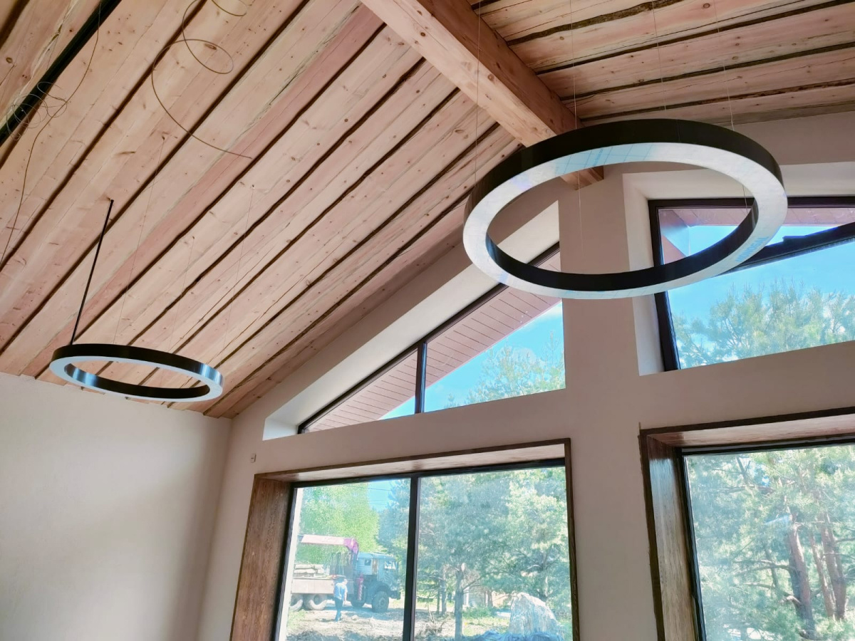 - Кольцеобразные светильники, в которых светодиоды располагаются по окружности. Они помогли бы создать отличный основной свет над зоной отдыха, готовки и бильярдной и смотрятся в целом гармонично.