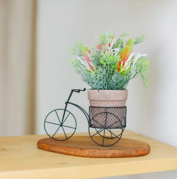 В отделе декора очень понравилось кашпо-велосипед. Смотрится стильно. Размер 19*10,5*13 см. Сразу вспомнились похожие металлические кашпо из Фикс-прайса. Их завозили в магазин несколько раз и они были разных цветов. В Домовом велосипед интереснее. У него больше размер и крупнее колеса.