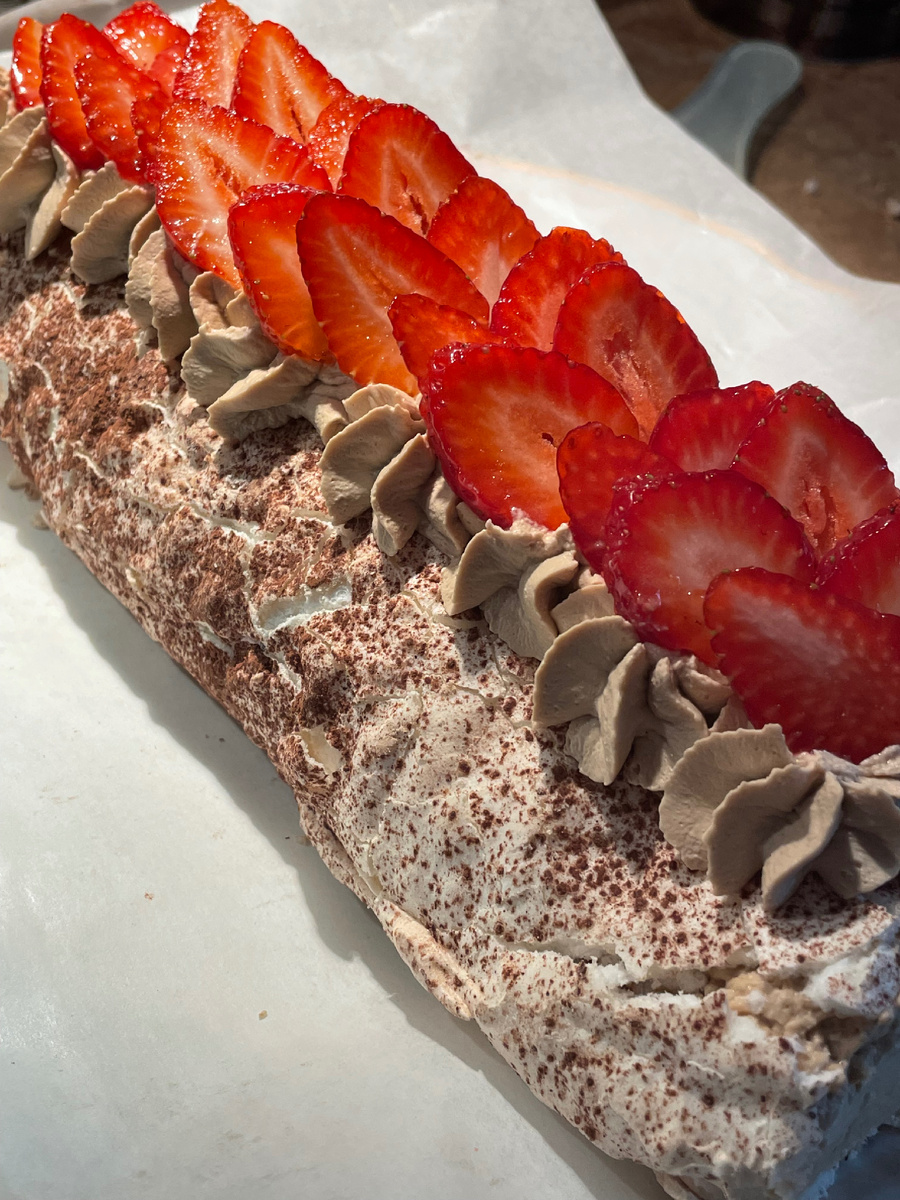 Всем привет! К сожалению, мне пришлось взять перерыв в блоге, но не в кулинарии)) Этот и прошлый год были для меня значимыми, трудными: я окончила школу. Теперь я иду в международный колледж Российского биотехнологического университета (РОСБИОТЕХ) и готова снова делиться вкусными, полезными рецептами! Буду рада вашему вниманию ☺️ Хочу поделиться рецептом вкусного меренгового рулета — тирамису. Десерт — как облако, такой же нежный, легкий и воздушный. Ингредиенты: Меренга ~200 г белка (комнатной температуры) ~1/3 чл соли ~1/4 чл лимонной кислоты ~300 г сахара ~30 г кукурузного крахмала ~1- 1,5ст.л. какао (без сахара) Кофейная заготовка ~30 г сливок (я беру тоже 35%) ~8 г растворимого кофе Крем ~200 г сливок 35% ~250 г маскарпоне ~40 г сахарной пудры алкоголь по желанию (я брала Бейлис) свежая клубника для декора (по желанию) Способ приготовления: 1. Для начала делаем кофейную заготовку. К горячим сливкам добавляем растворимый кофе и перемешиваем до полного растворения. За