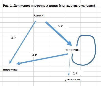В стандартных условиях (то есть, без льготной ипотеки) движение кредитных денег выглядят примерно как на рис. 1. Основной поток банковских денег идет во вторичку. Но это во многом иллюзия, т.к. основу тут составляют альтернативы (круговая стрелка на рисунке). Это когда продавцы реализуют свою квартиру, а на вырученные деньги покупают другую недвижимость (либо новостройки, либо другую вторичку). Совершив некоторое количество оборотов, почти все ипотечные деньги со вторички попадают опять к застройщикам! И лишь небольшая часть возвращается в банковскую систему (кладется на депозиты).