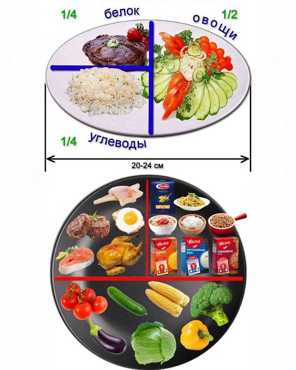 Сегодня хотел бы рассказать вам про так называемое "правило тарелки". Оно наглядно помогает вам разделить вашу пищу на части и сбалансировать питание. 🍽 Следуя “правилу тарелки”, можно быть уверенным, что соотношение различных продуктов в блюде будет правильным и сбалансированным 🍽 Расскажу подробнее про технику. 🥣 Мысленно делим тарелку на 4 сектора: 🥦Два сектора следует заполнить овощами: - тушеными - на гриле - на пару - свежими - запечёнными 🍝Один сектор крупами и злаками: - гречка - рис - пшено - макароны - булгур - киноа - хлеб ржаной или ц/з 🍗И еще один – белковой пищей: - яйца - курица - индейка - телятина - кролик - рыба Что происходит: 👌🏻 ощутимое увеличение овощей в рационе 👌🏻 достаточное потребление белков и круп 👌🏻 контроль количества и примерной калорийности пищи 👌🏻 выработка привычки следить за рационом ❗️ Что вы можете не делать, если используете правило тарелки: ❌ Взвешивать продукты ❌ Высчитывать калории 💪🏻 Это один из главных пунктов