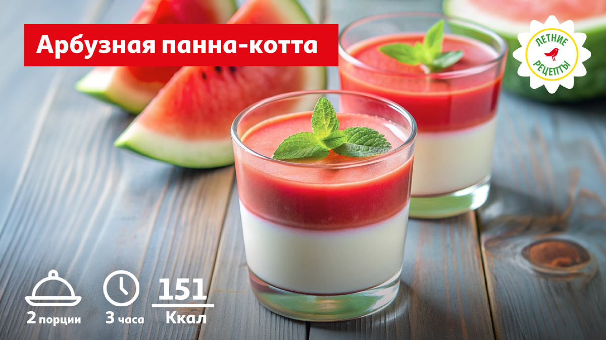 Один взгляд на этот десерт поднимает настроение, что же будет, если его попробовать? Сейчас и проверим. В рубрике наших рецептов сегодня главный герой августа — арбуз. Как насчет воздушной панна-котты на десерт? 1) Ингредиенты для сливочного слоя: Сливки 20% — 200 мл; Мякоть арбуза — 100 г; Сахар — 40 г; Желатин — 10 г; Ванилин — щепотка; Вода — 20 мл. Для арбузного слоя: Мякоть арбуза — 100 г; Сахар — 1 ч. л.; Сок лимона — 1 ч. л.; Желатин — 5 г; Вода — 20 мл; Мята для украшения — 1–2 листика. Готовим! Первым нужно приготовить сливочный слой. Залейте 10 г желатина 20 мл воды и оставьте для набухания — хватит 10–15 минут. Влейте в кастрюлю сливки, добавьте сахар и щепотку ванилина, хорошенько перемешайте. Нужно нагреть жидкость, но не кипятить — это важно. Очистите арбуз от косточек, отрежьте корки, чтобы осталось 200 г чистой мякоти. Половину используйте сейчас, а другую оставьте на арбузный слой. Измельчите блендером до практически жидкого состояния. Возвращайтесь к сливкам. Горячо?