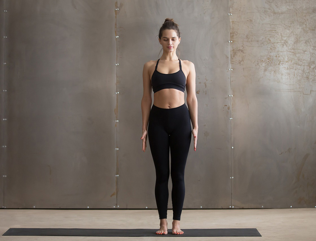 Встаньте прямо, поставив ноги вместе так, чтобы большие пальцы соприкасались. Выпрямите ноги, соедините ладони, согните локти, поднимите руки, при этом сомкнутые большие пальцы должны находиться на уровне ключицы. Лопатки опустите вниз, напрягите бедра, втяните живот и опустите копчик. Задержитесь в этой позе, затем расслабьте мышцы и потрясите руками и ногами. Выполните 2 повтора.