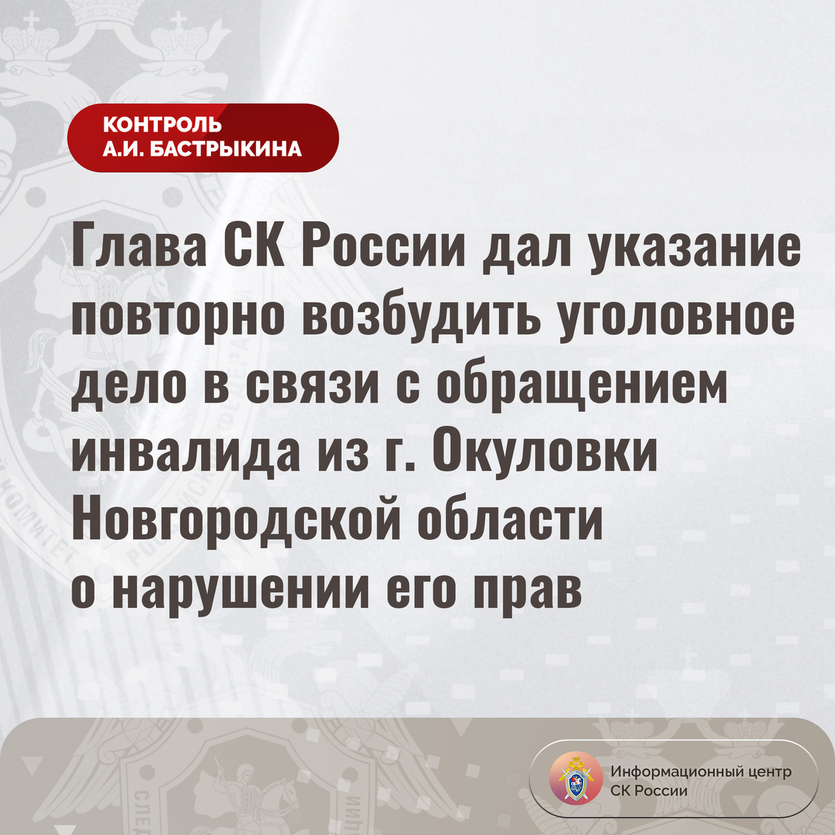 Глава СК России дал указание повторно возбудить уголовное дело в связи с обращением инвалида из г. Окуловки Новгородской области о нарушении его прав