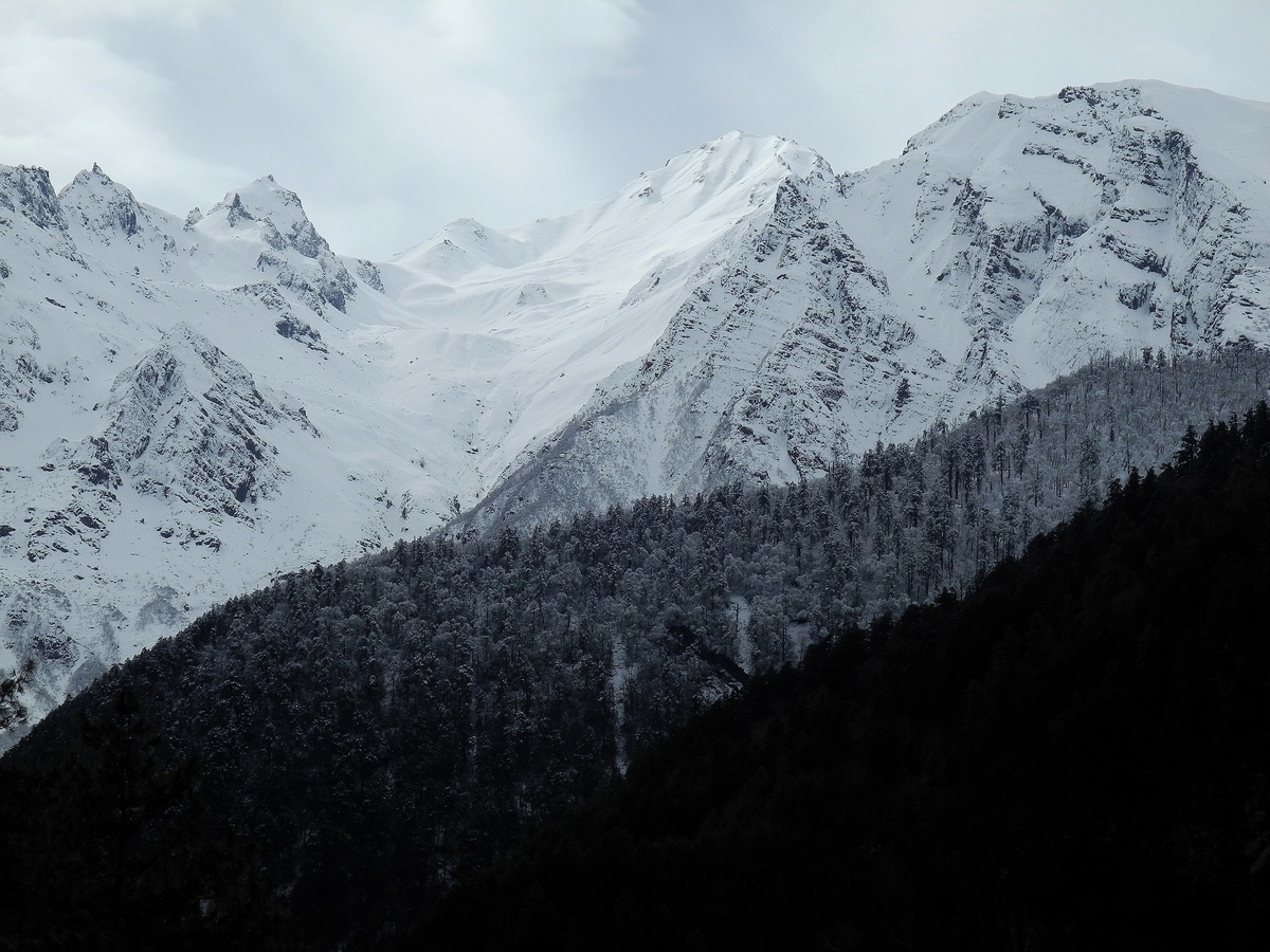 День обещает быть хорошим. Верхушки гор заснежены. Хвойный лес. Людей стало больше.