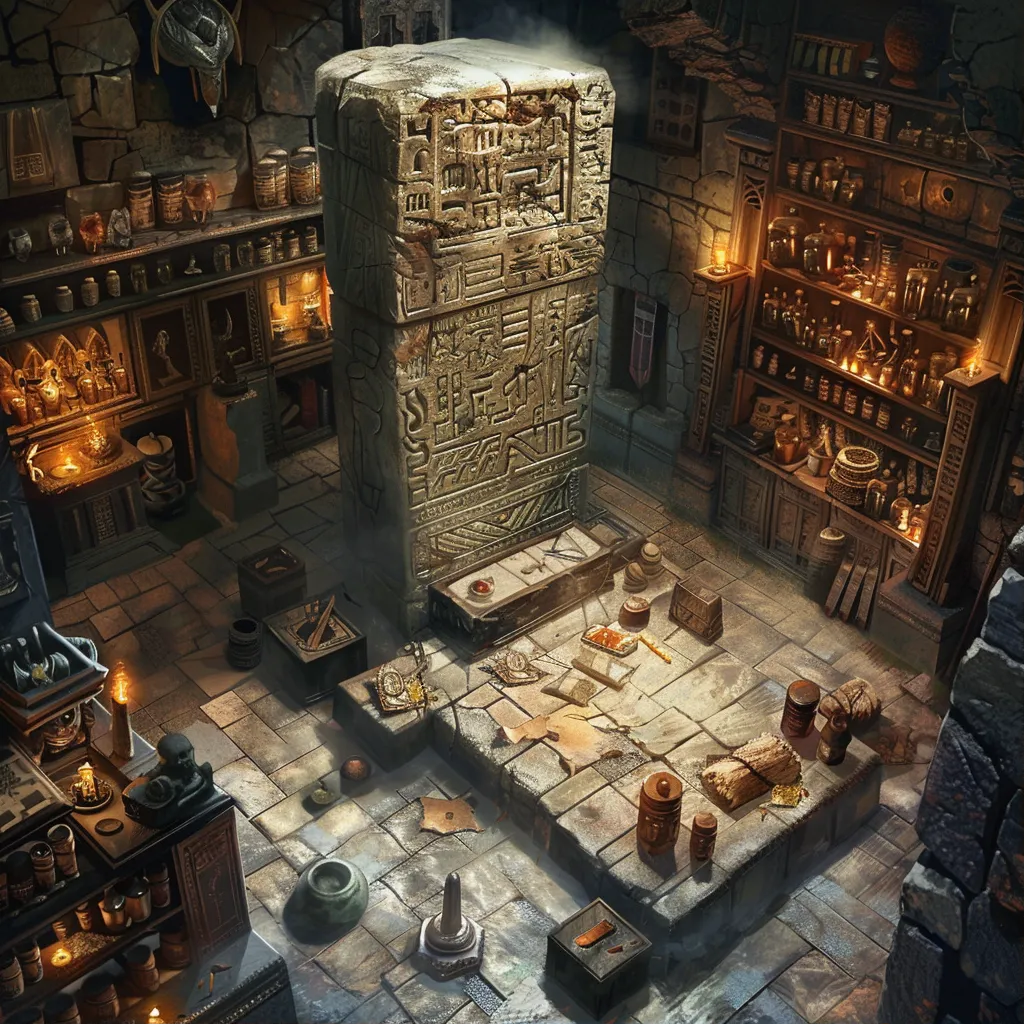 В центре комнаты стоял массивный каменный алтарь, покрытый древними рунами и символами, значение которых давно утеряно. Вокруг алтаря были расставлены шкафы и полки, заставленные разнообразными артефактами, свитками и зельями, многие из которых принадлежали разным эпохам. На одной из полок лежал свиток из пергамента, казавшийся таким хрупким, что его можно было развеять простым прикосновением. На стенах висели картины, изображающие сцены из прошлых времён: магические дуэли, создание заклинаний, путешествия по другим мирам. Каждый предмет, каждая мелочь в этой комнате казались пропитанными историей и магией, создавая ощущение присутствия чего-то великого и таинственного.