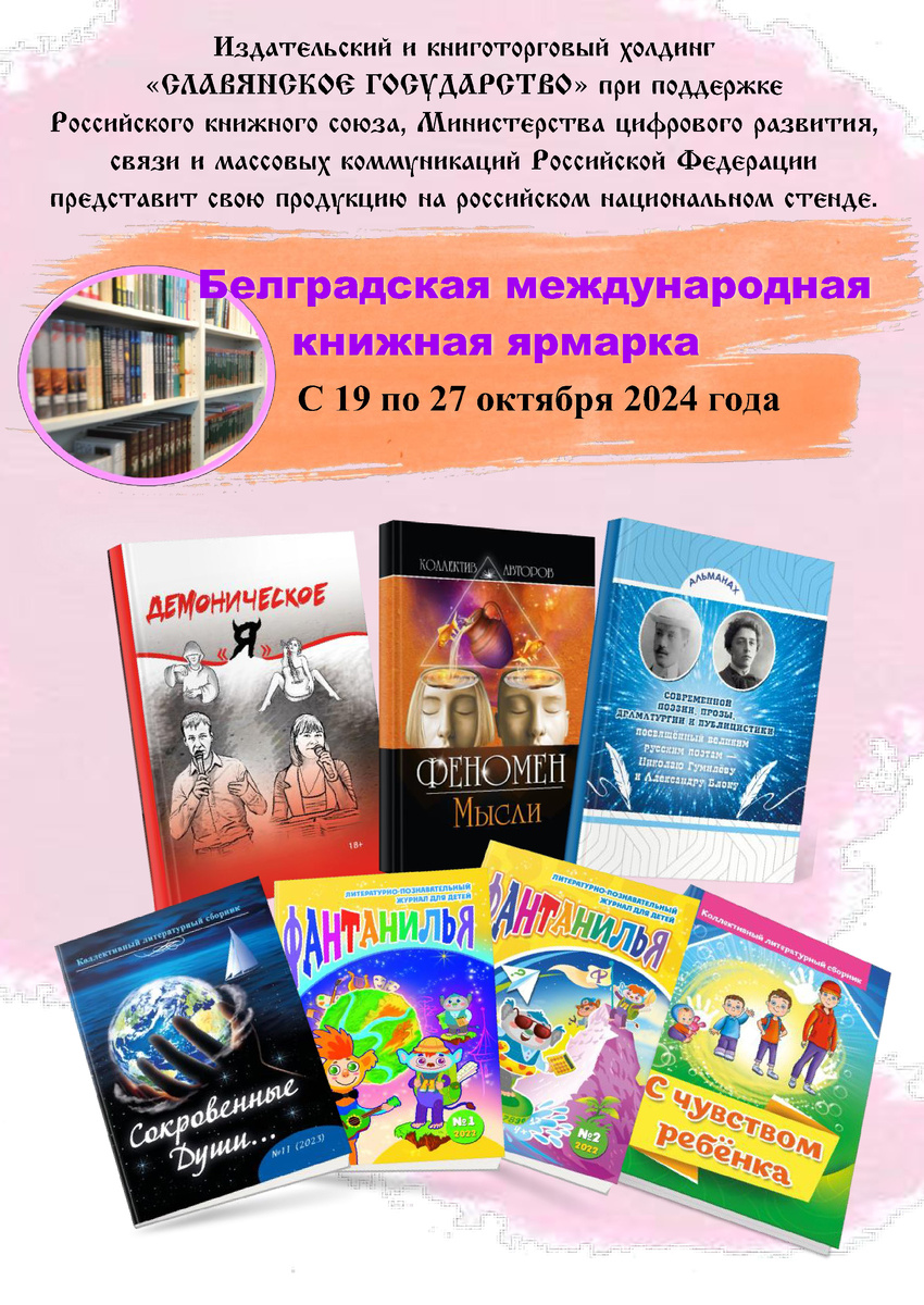 Издательский и книготорговый холдинг «СЛАВЯНСКОЕ ГОСУДАРСТВО» при поддержке Российского книжного союза, Министерства цифрового развития, связи и массовых коммуникаций Российской Федерации представит свою продукцию на российском национальном стенде.