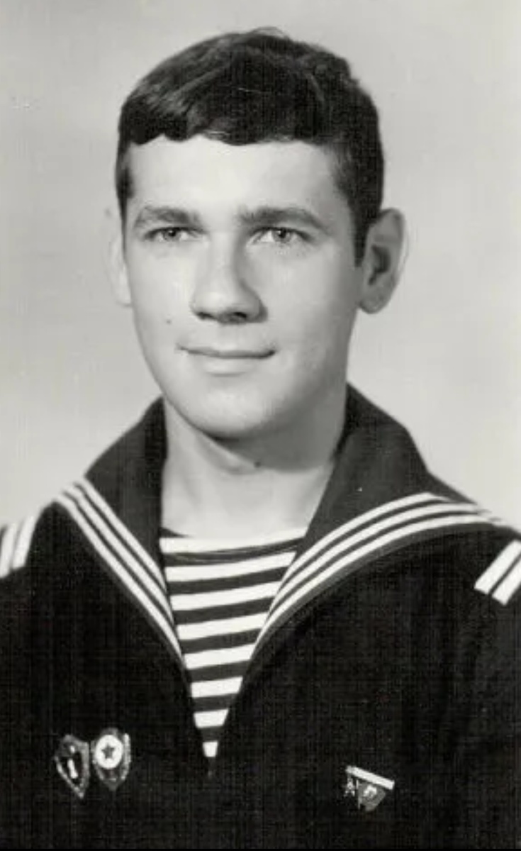 Портретная фотография старшины 2-й статьи в форменной рубахе и тельняшке. На груди моряка видны несколько нагрудных знаков. На правой стороне груди расположен знак специалиста 1 класса и знак «Отличник ВМФ». На левой стороне груди виден значок члена ВЛКСМ и, предположительно, сувенирный значок «Севастополь». Подписи на обратной стороне снимка нет. Фото из семейного архива Олега Кожевникова, подписчика канала. Если вы хотите поделиться своими фотографиями 1930-1990 годов – присылайте их на почту istorikmoskalev@mail.ru, и они будут опубликованы на канале.