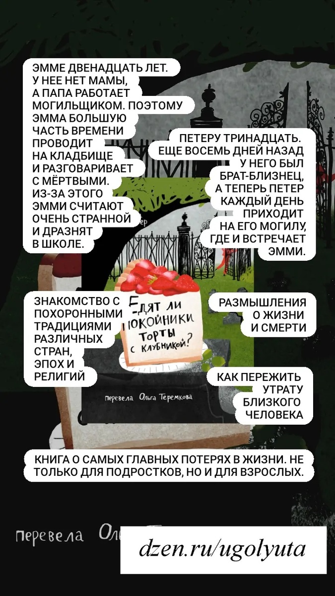 Вчера дочитала книгу Розмари Айхингер "Едят ли покойники торты с клубникой?". Книга с ярким названием. Подойдет для чтения и подросткам, и взрослым. Книга небольшая, но очень интересная. Здесь тяжёлые темы подаются легко и светло. Тема смерти, похоронных традиций и верований, как пережить утрату близкого человека и как общаться с человеком, пережившим такую утрату и как ему помочь - может показаться что это сложная книга. Но это рассказ о двух подростках, поэтому всё написано простым языком.